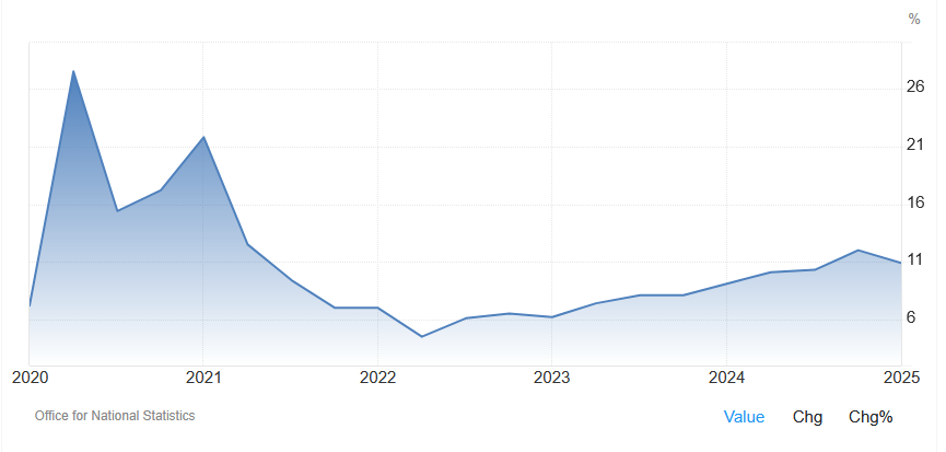 “Household Saving Rate in the United Kingdom decreased to 10.90 percent in the first quarter of 2025 from 12 percent in the fourth quarter of 2024. Personal Savings in the United Kingdom averaged 7.77 percent from 1955 until 2025, reaching an all time high of 27.50 percent in the second quarter of 2020. source: Office for National Statistics”