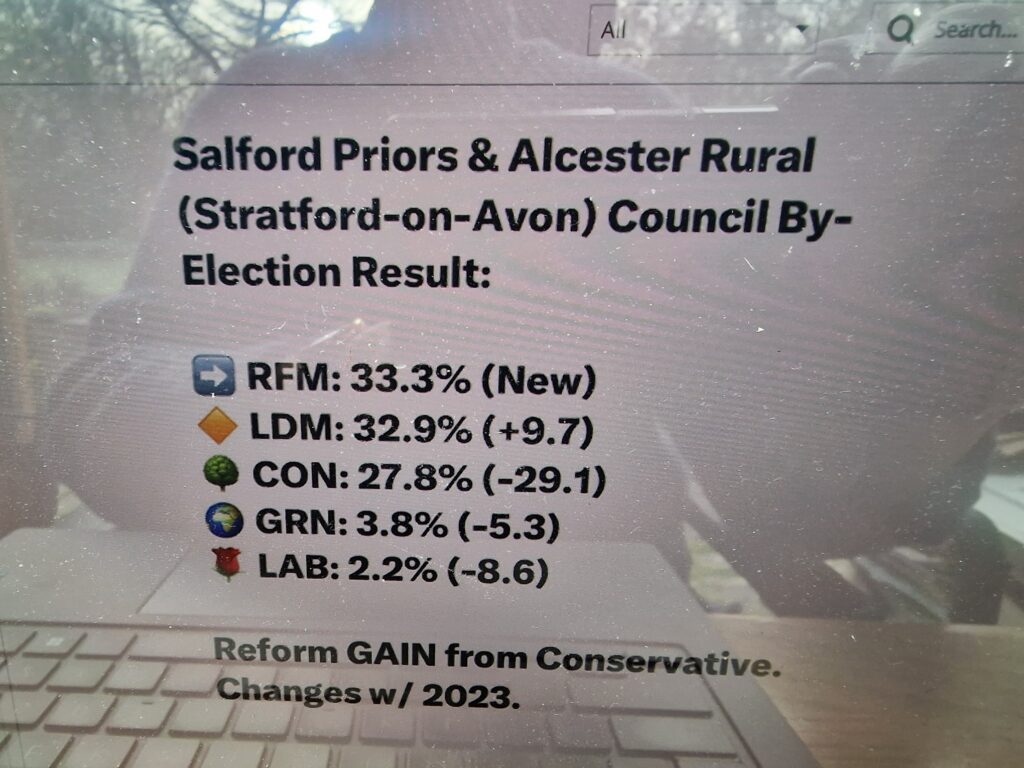 While Reform ploughs on, a recent by-election close to the snipe’s marsh, saw this result.